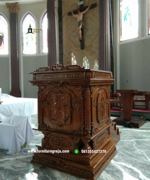 Mimbar gereja modern  adalah  salah  satu produk  unggulan yang sering dipesan oleh banyak gereja  yang telah menghiasi  sebagai interior gereja di seluruh Indonesia karena mempunyai karakteristik ukuran dan kehalusan dalam  pahatan  kayu  sehingga mejadikan gereja lebih artistik  dan menambah kemegahan gereja yang dapat mejadikan ibadah lebih tenang