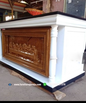 Meja altar gereja berbentuk persegi panjang, dan didepan terdapat relif perjmuan kudus dan disertai aneka bentuk ukiran dan relif sesuai permintaan daerah masing – masing, meja altar terdapat aneka macam model dan motif. Motif polos meja altar tidak terdapat ukiran maupun relif berbeda dengan motif ukiran terdapat banyak macam ukiran di meja altar gereja